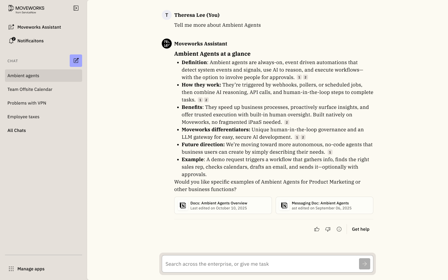 Employees spend most of their day working in the browser, and Assistant on Web brings the full power of Moveworks right into that flow. It’s the center of work — the place where employees can find information, complete tasks, and collaborate without switching tools or losing focus.