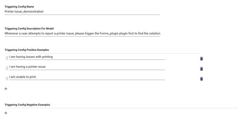 - Triggering Config Positive Examples: This is where you need to add the same utterances which were defined above in the User Step initially.
