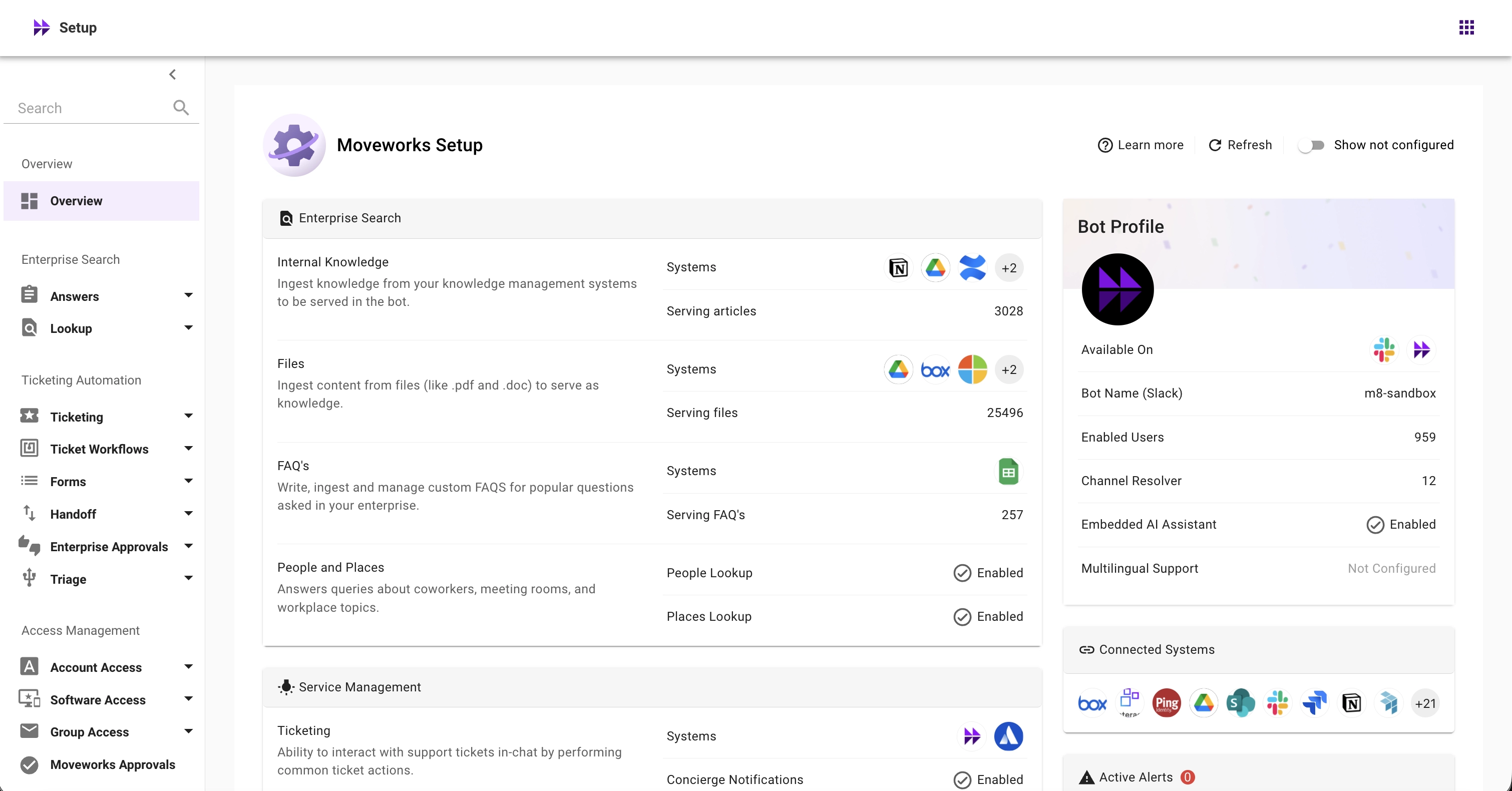 - Connected systems health: Monitor health of connected systems by reviewing whether Moveworks is able to successfully crawl and ingest files from your connected systems