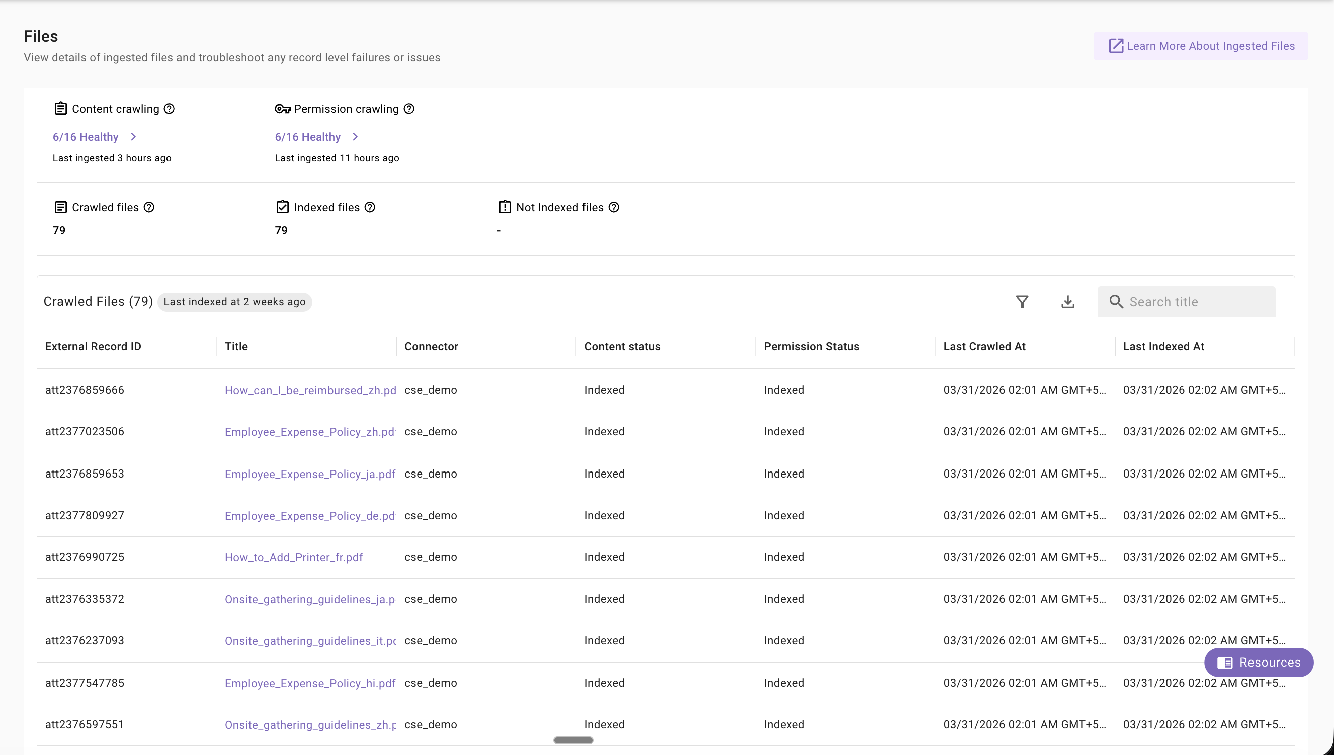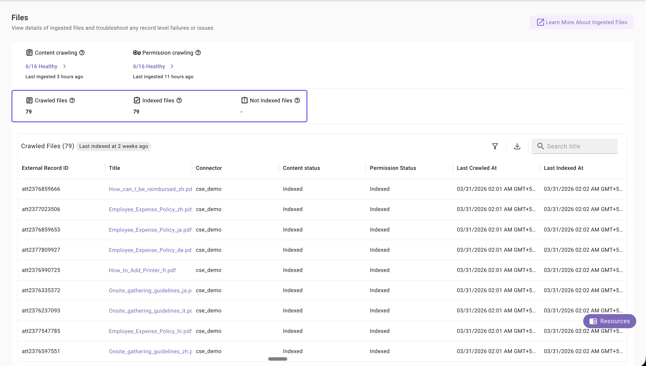 - Content Ingestion: Monitor file ingestion systems’ health, view ingestion runs with logs, and error summaries, and quickly access connector and ingestion configs