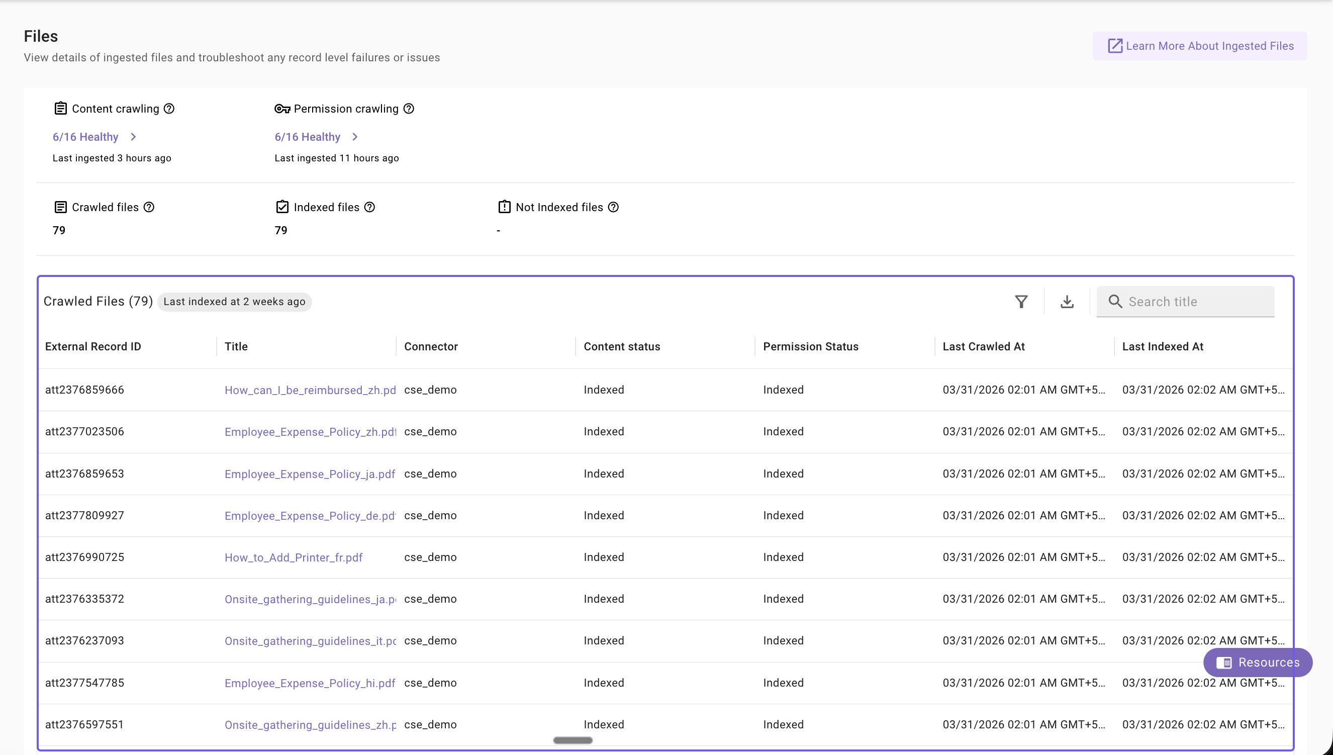 - Permission Ingestion: Monitor permission ingestion systems’ health, view ingestion runs with logs, schedules (full and incremental), and error summaries, and quickly access connector and ingestion configs