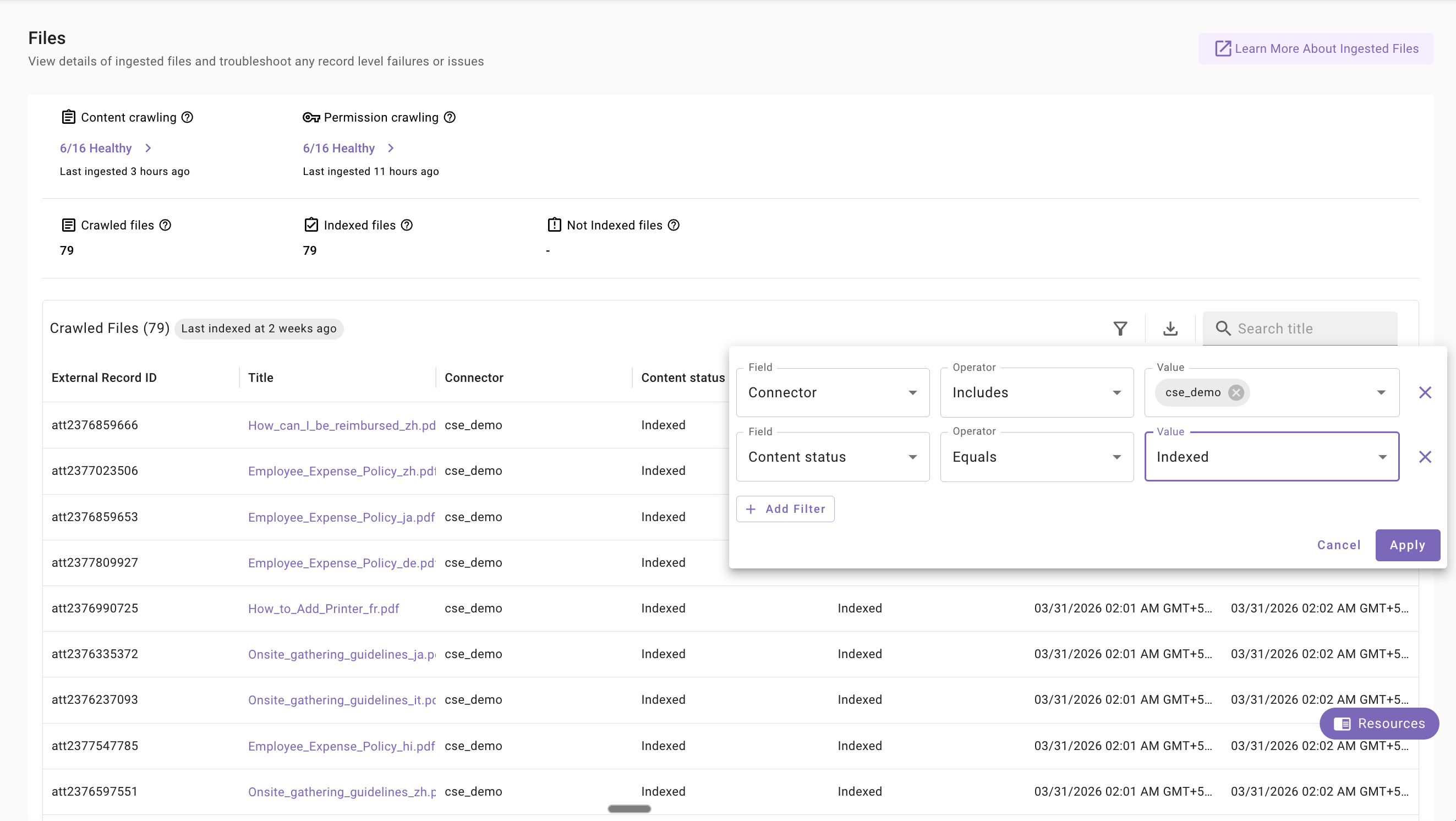 - Content Status: Filter files by their current status (Indexed or Not Indexed) to identify files available to users or troubleshoot issues