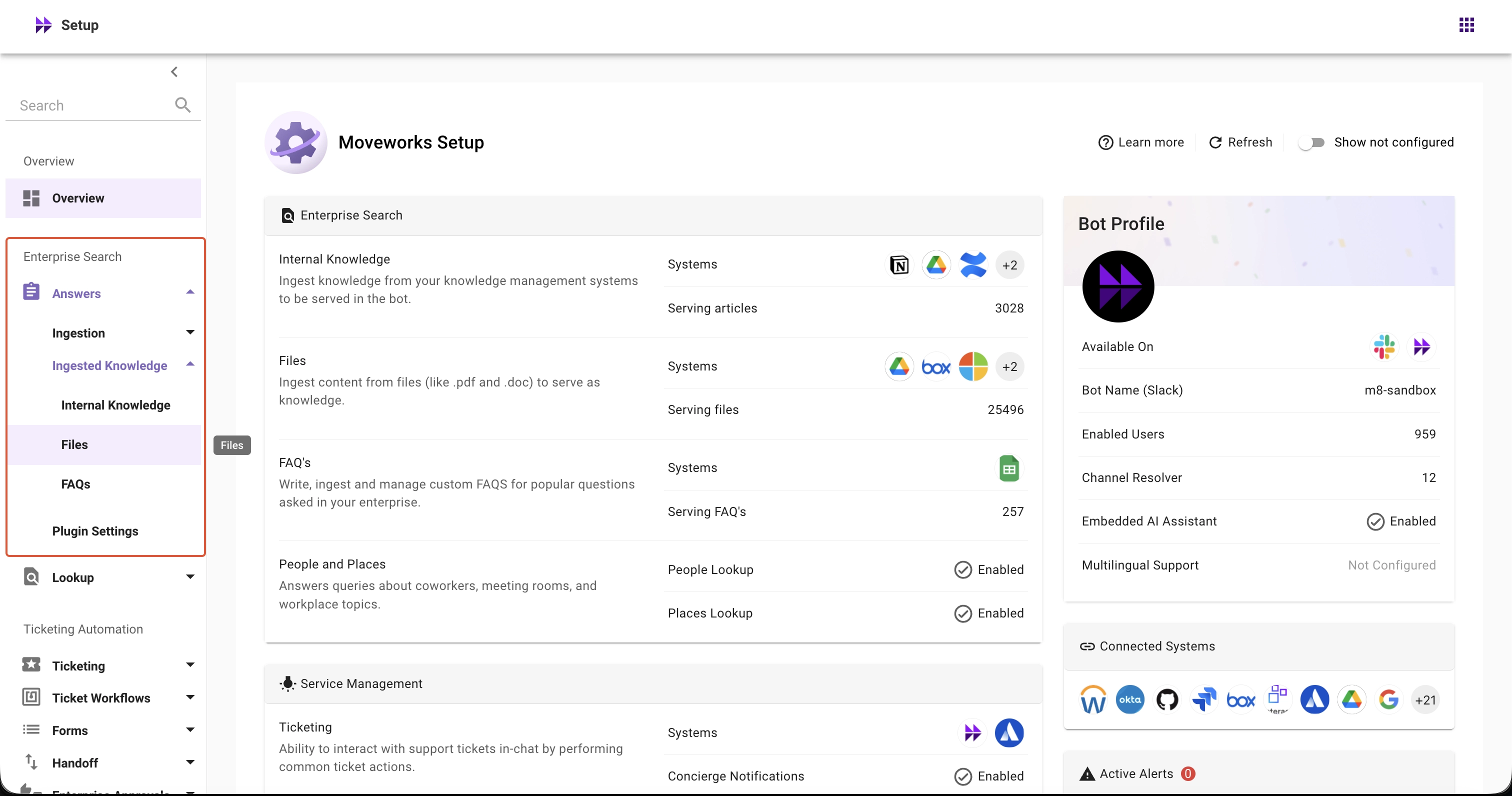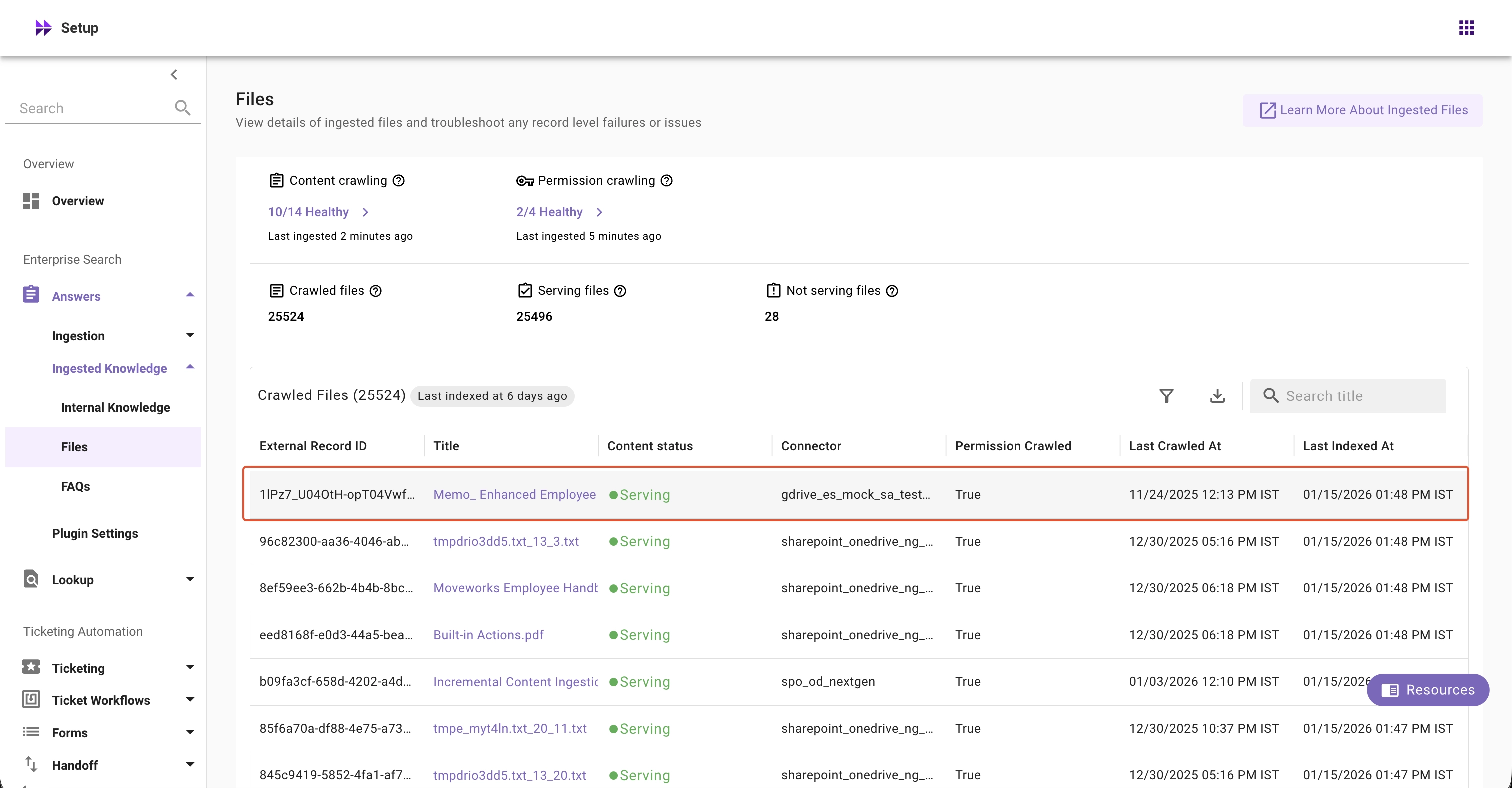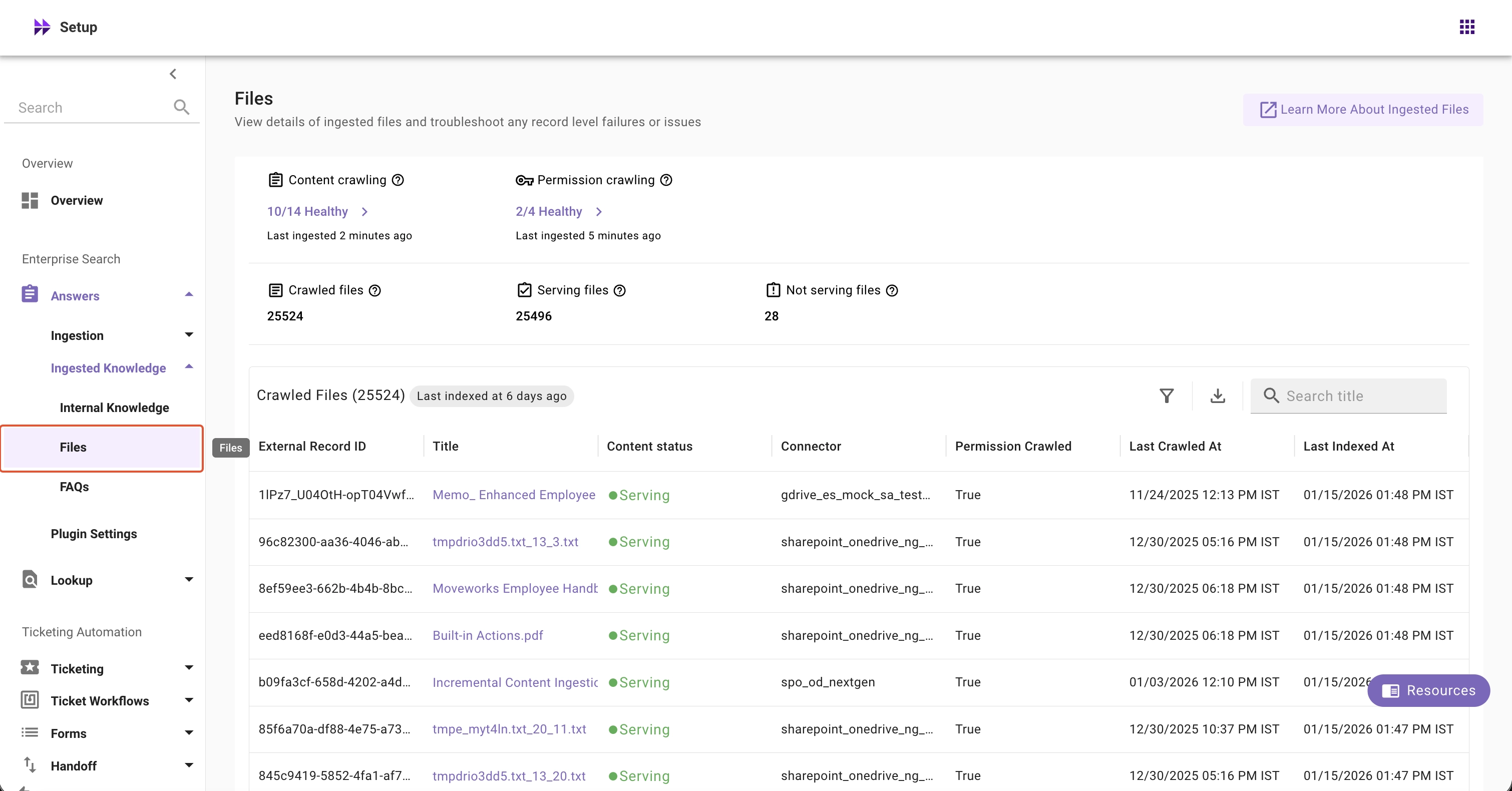 - Indexed Files: Count of unique records that Moveworks has successfully processed and indexed.