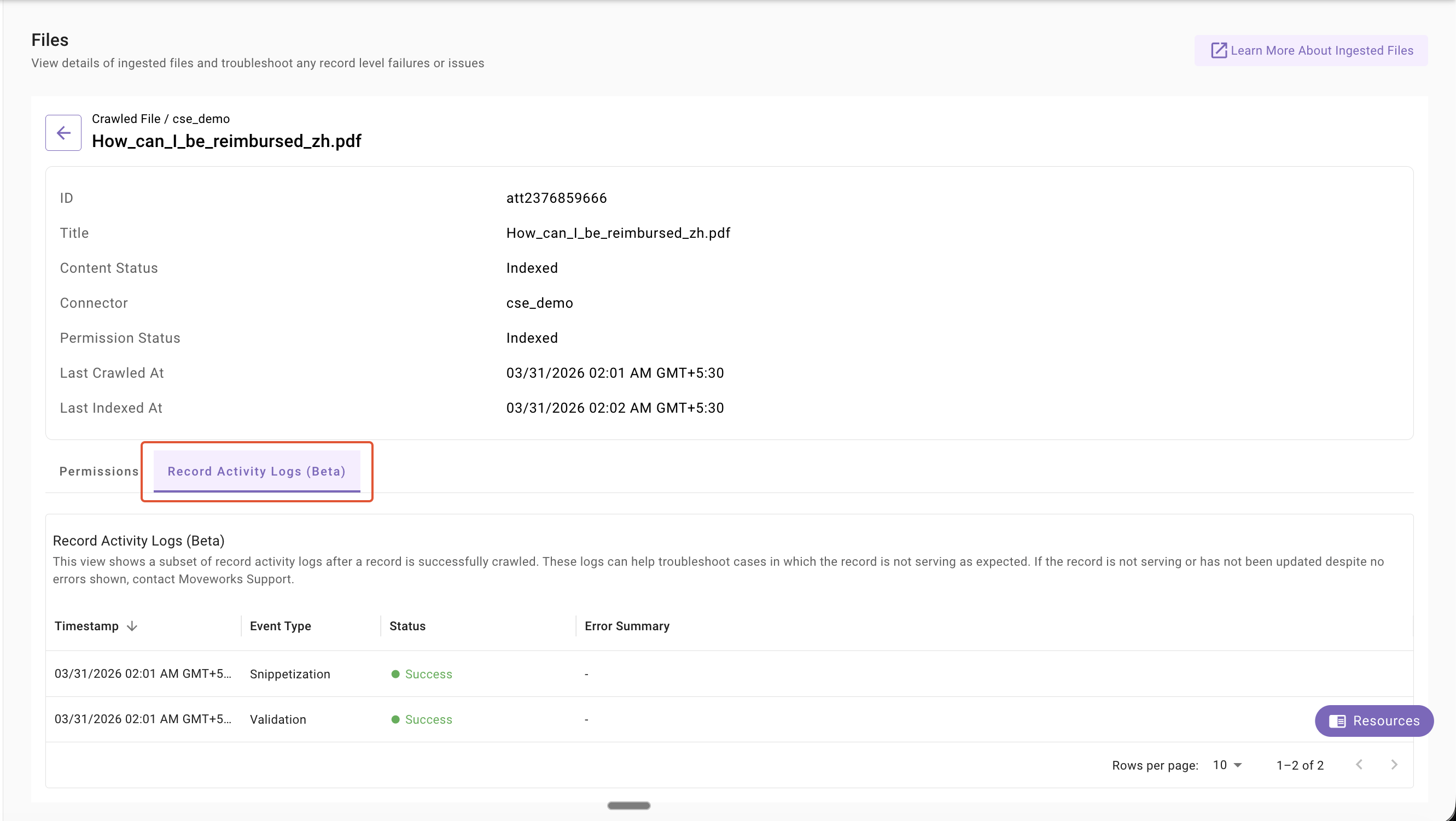 Record Activity Logs help Moveworks admins understand whether a record was successfully processed or failed during these steps, enabling effective troubleshooting of content that is not being served.