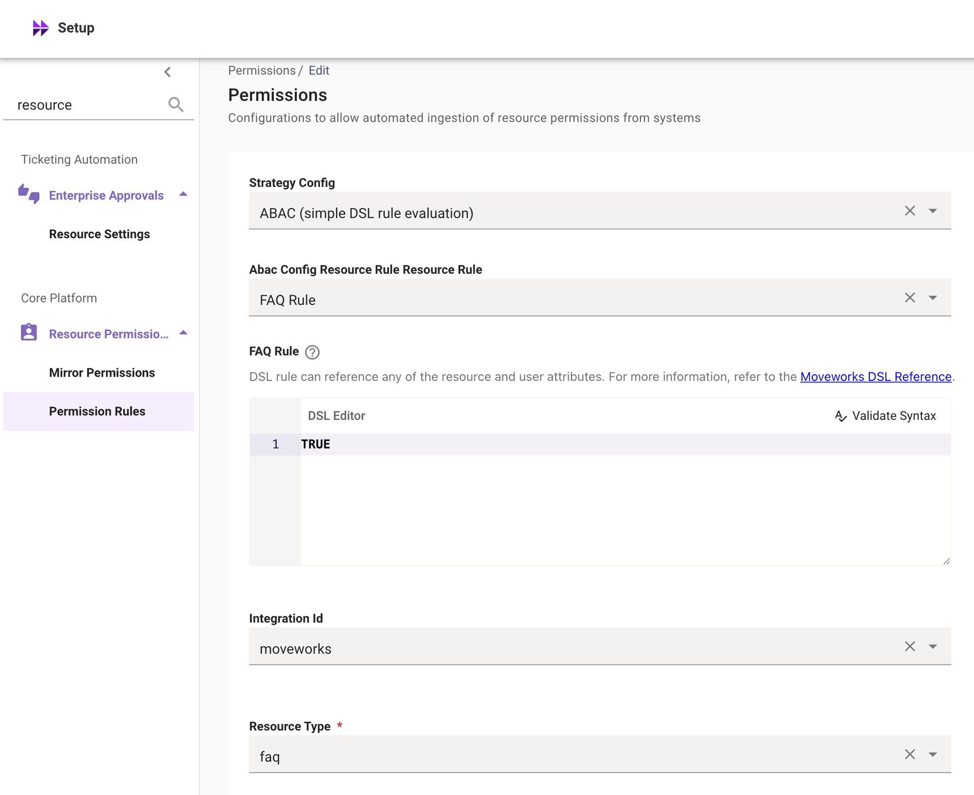 Setting the DSL rule to TRUE grants all users access to all FAQs. If you need to restrict FAQ visibility to specific users or groups, replace TRUE with a DSL expression scoped to the appropriate audience.