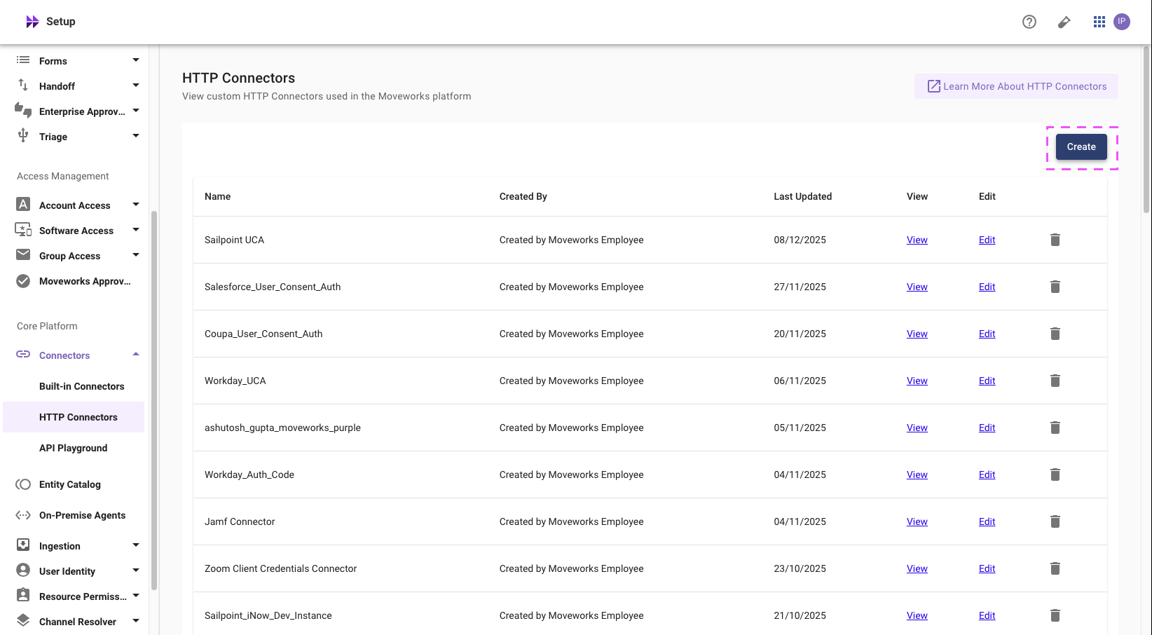 Head over to Moveworks Setup > Core Platform > Connectors > HTTP Connectors
