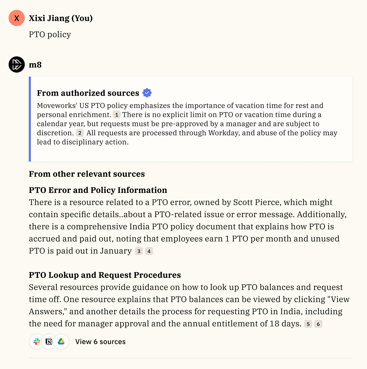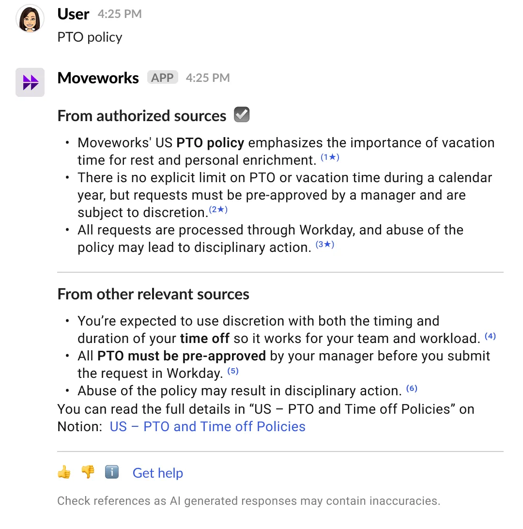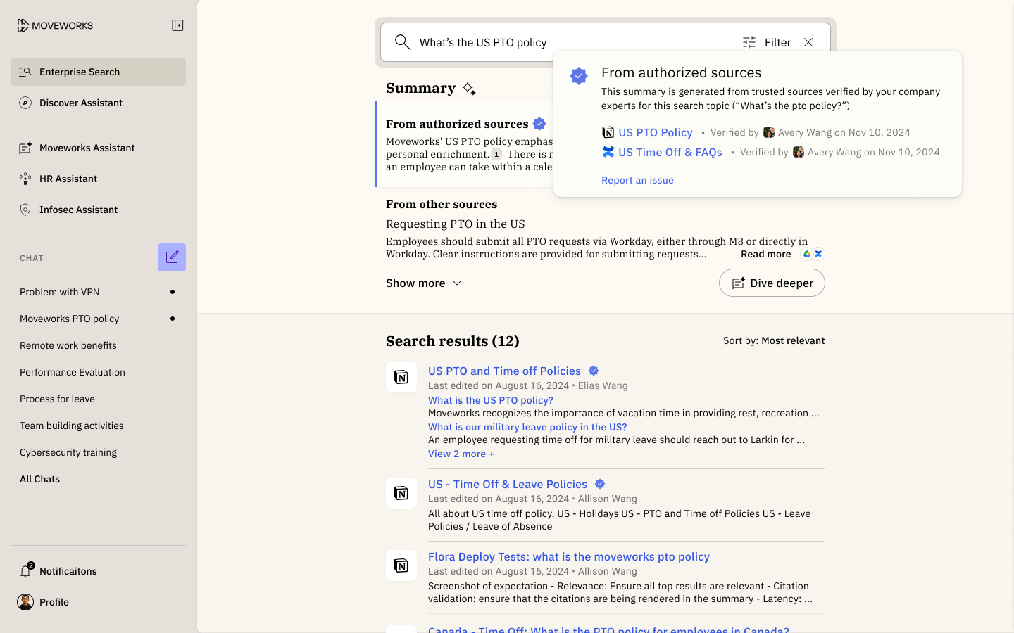 Vetted Content helps users quickly identify and find approved, authoritative information in Moveworks Assistant and Enterprise Search.