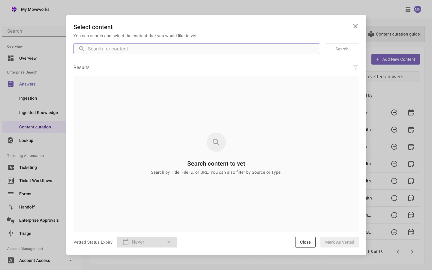 - Anyone with access to Moveworks Setup can configure or manage vetted content.
