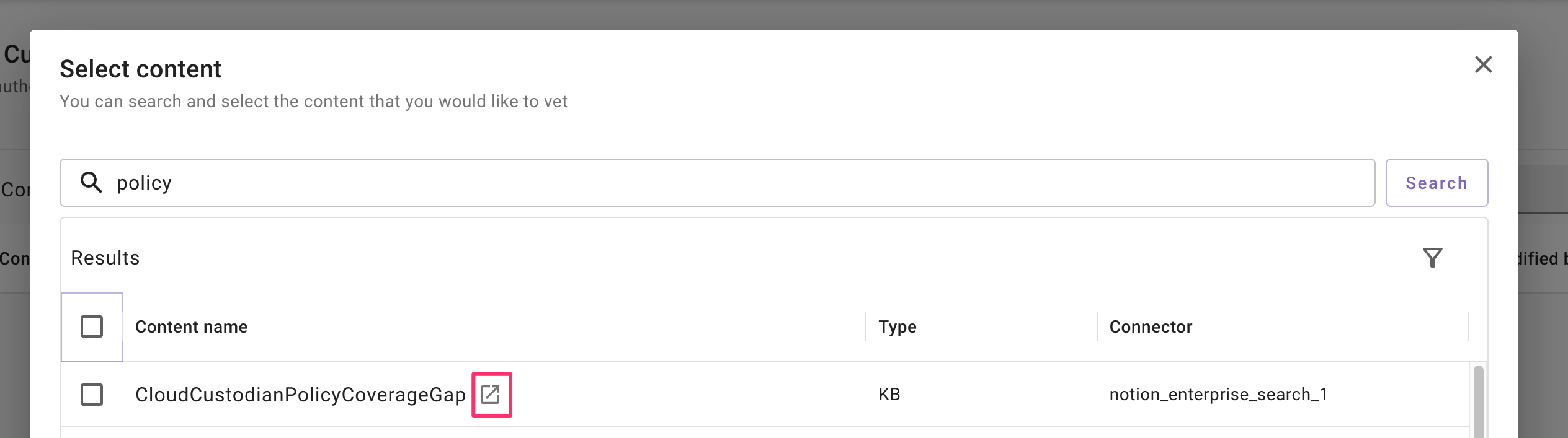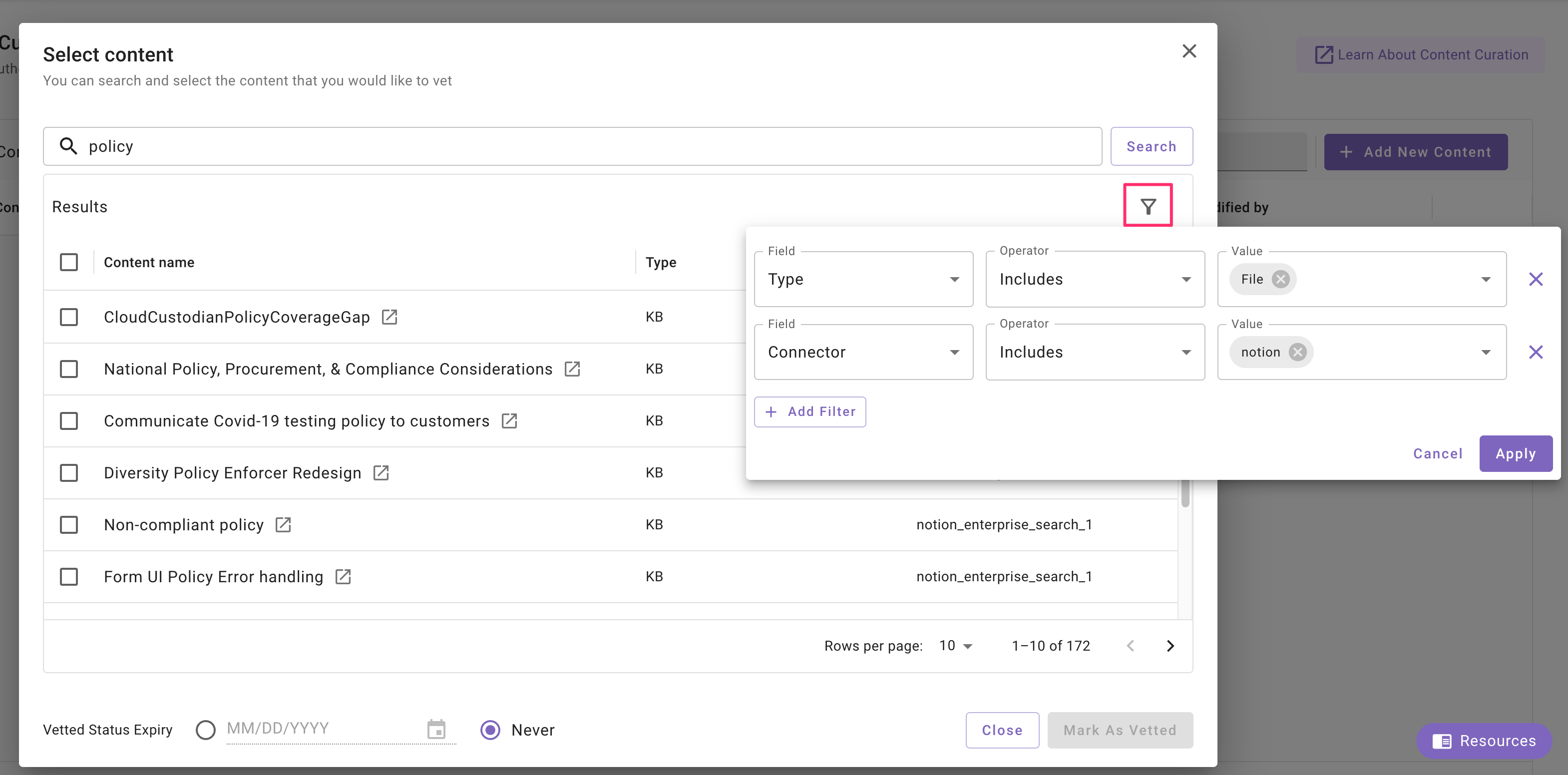 In the Select content modal, use the search box to find the ingested files or KB articles you want. You can search by Title, File ID, or URL to find content easier. To narrow down the file or KB article you’re looking for, click the filter icon and filter by: