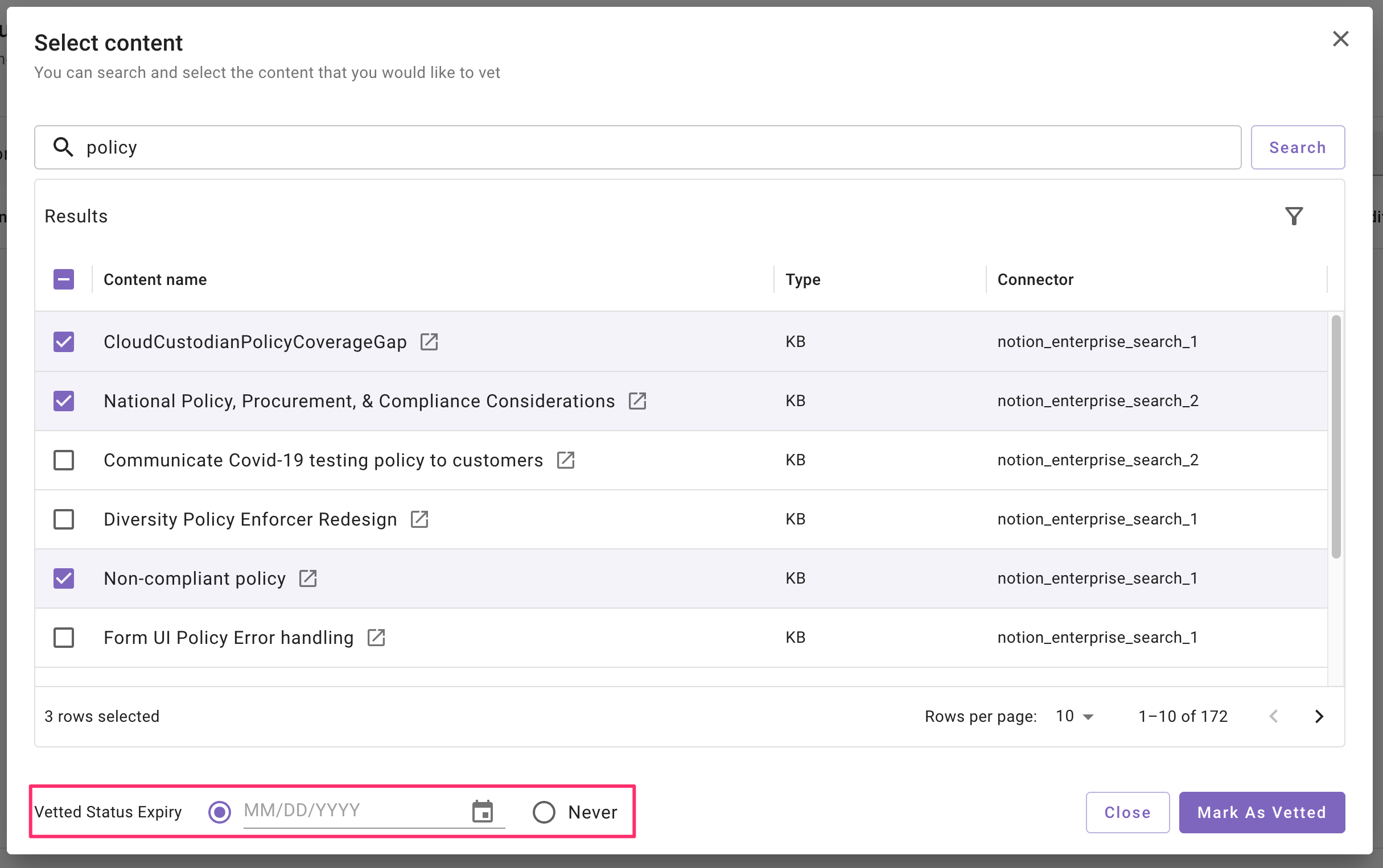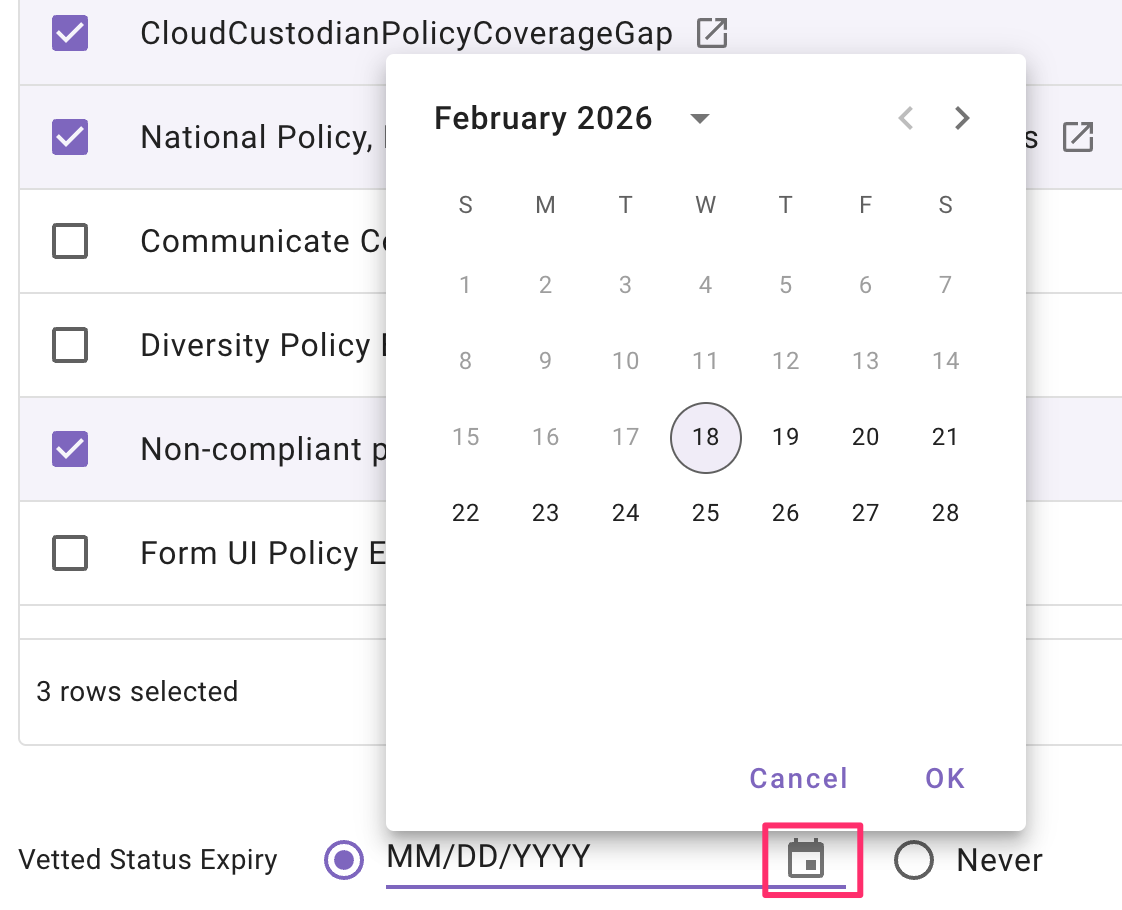 The default expiration for vetted status is Never. To set an expiration date, click the calendar icon and choose a date. If you select multiple items, the same expiration date will be applied to all selected items.
