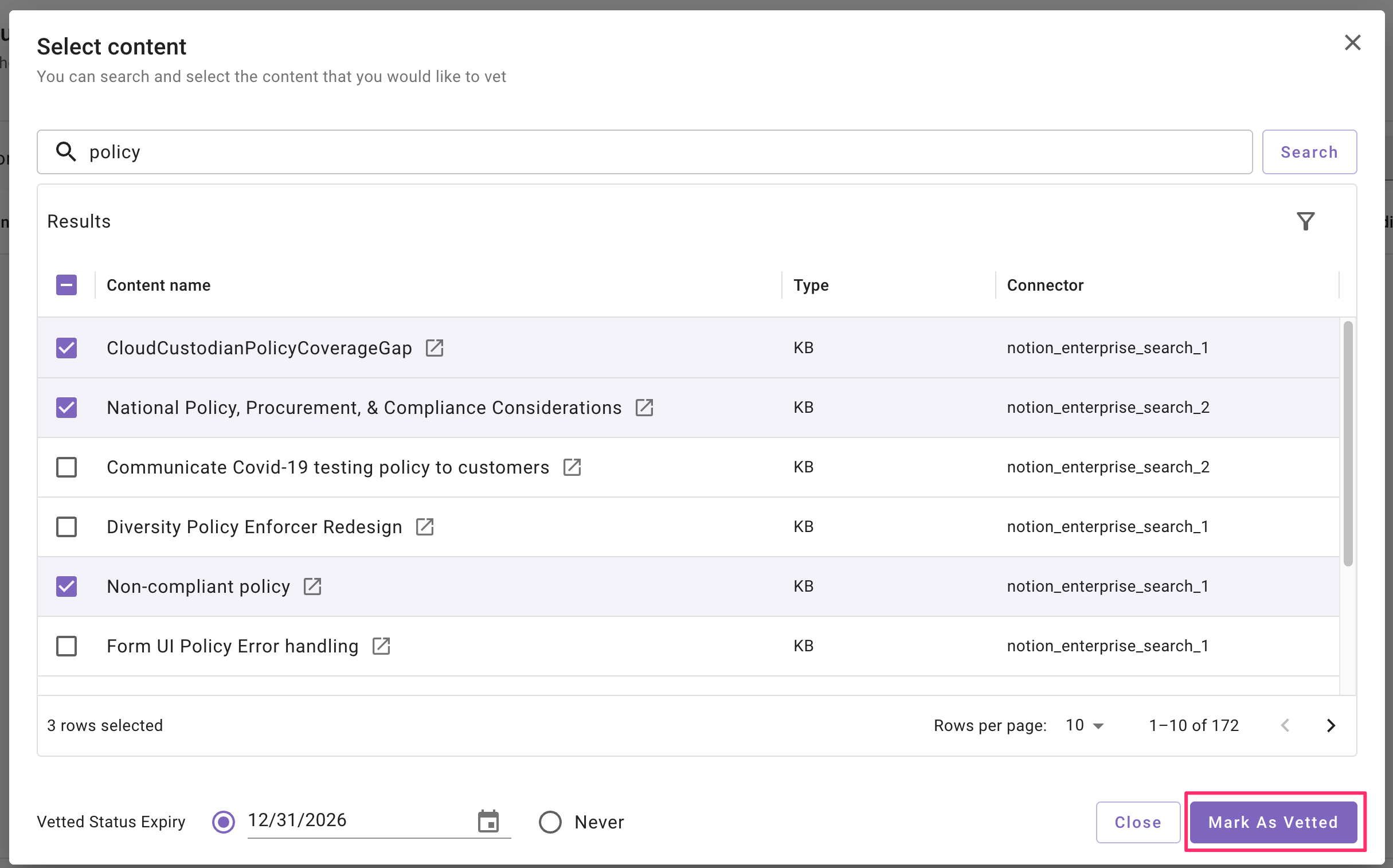 Select items and mark as vetted. Select one or more items from results.