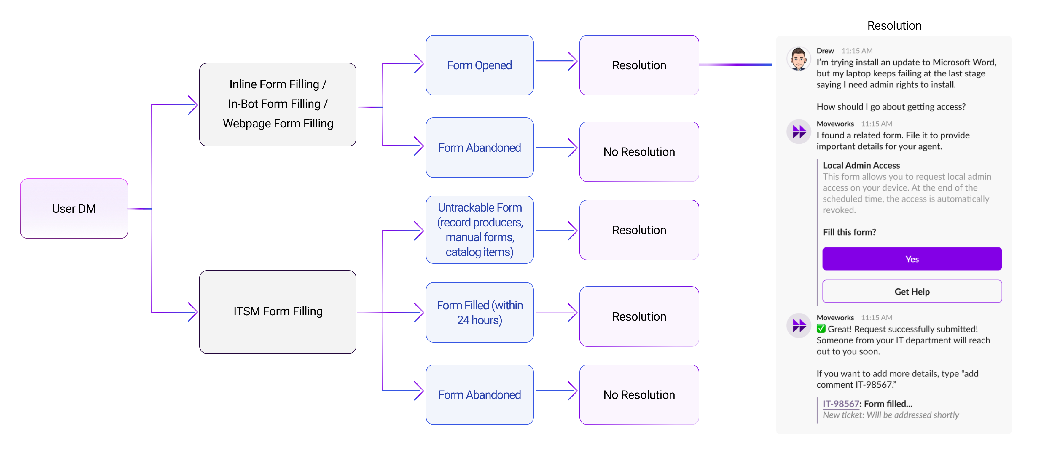 - If a user is redirected to an ITSM system integrated with the bot (in which bot can track the Form being submitted), and then files a Form in that system.