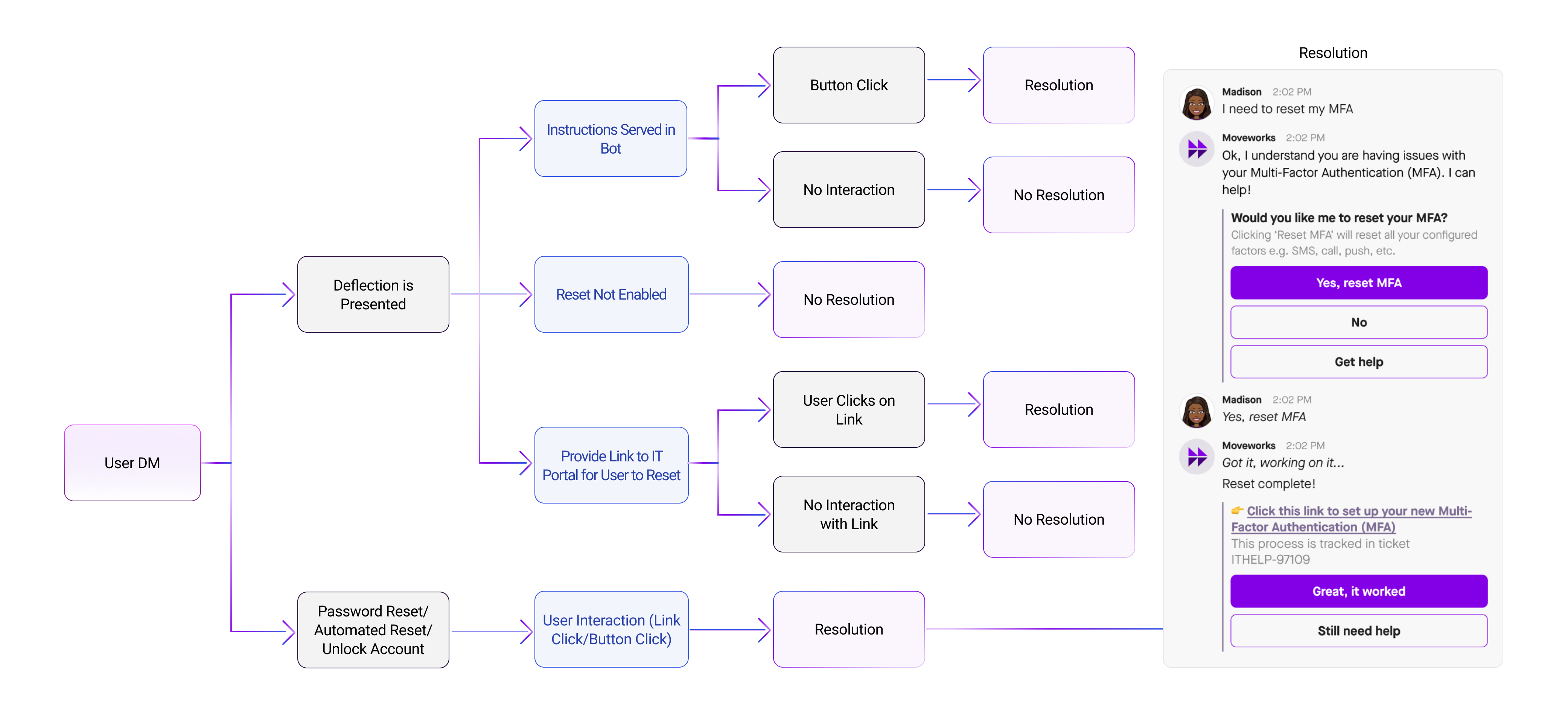 API integration: If an integration allows Moveworks to update user credentials directly, this action is counted toward resolution. In particular, when the bot generates a link to reset user password, and the user is forced to reset their password; this flow is counted toward resolution. Another case of this is when the bot unlocks a locked user account.