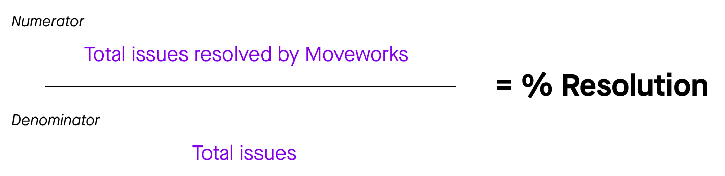 The Resolution Numerator is the total number issues resolved by the Moveworks bot. See the Resolution section to learn what Moveworks counts as resolution and count towards the Resolution Numerator.