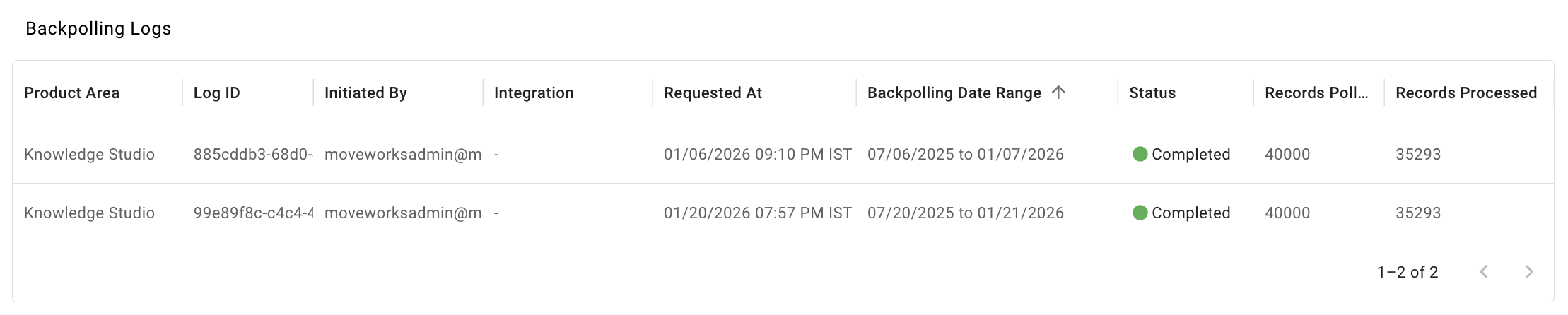 - There are three status: Initialising, In Progress, Complete. Metrics “Records polled” and “Records processed” can be used as a proxy to know the status of ticket backpolling.