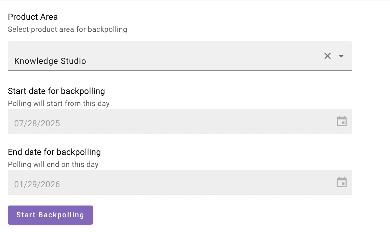 - Knowledge Studio ticket backpolling runs across all integrations. The integration selection field is not available for this feature.